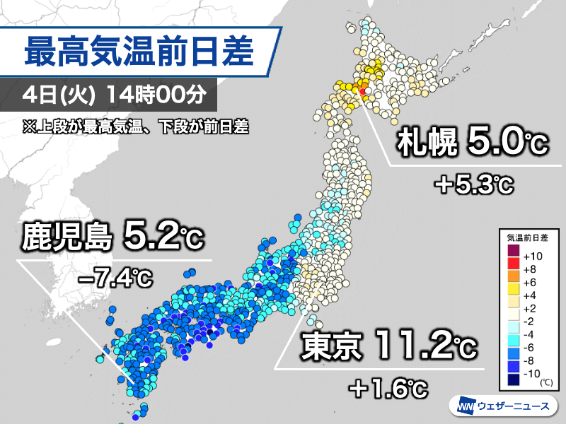 一方、低気圧に近い北海道は寒気の影響が弱く、昨日より気温の上がっている所が多くなっています。札幌市の最高気温は5.0℃、14時現在の気温は2.9℃です。最高気温、14時現在の気温ともに、鹿児島市と札幌市の気温がほぼ同じになっています。