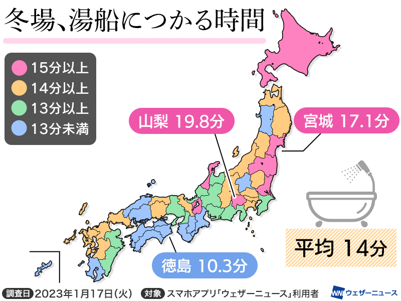 冬場、お風呂につかる時間は平均14分 西日本ほど短い傾向