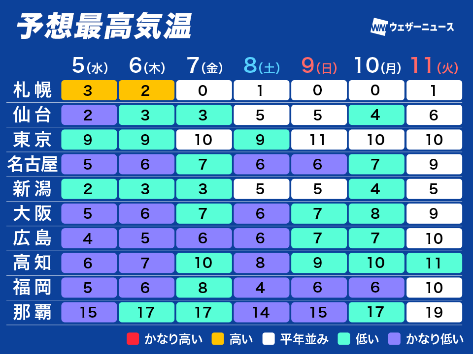 各地の最高気温の予想を見ると、東海から西日本は9日(日)にかけて平年よりかなり低い日が多いことがわかります。名古屋や大阪、広島、福岡では一桁の日が続く見通しです。那覇も15℃を下回り、上着が必要な寒さとなる日があります。