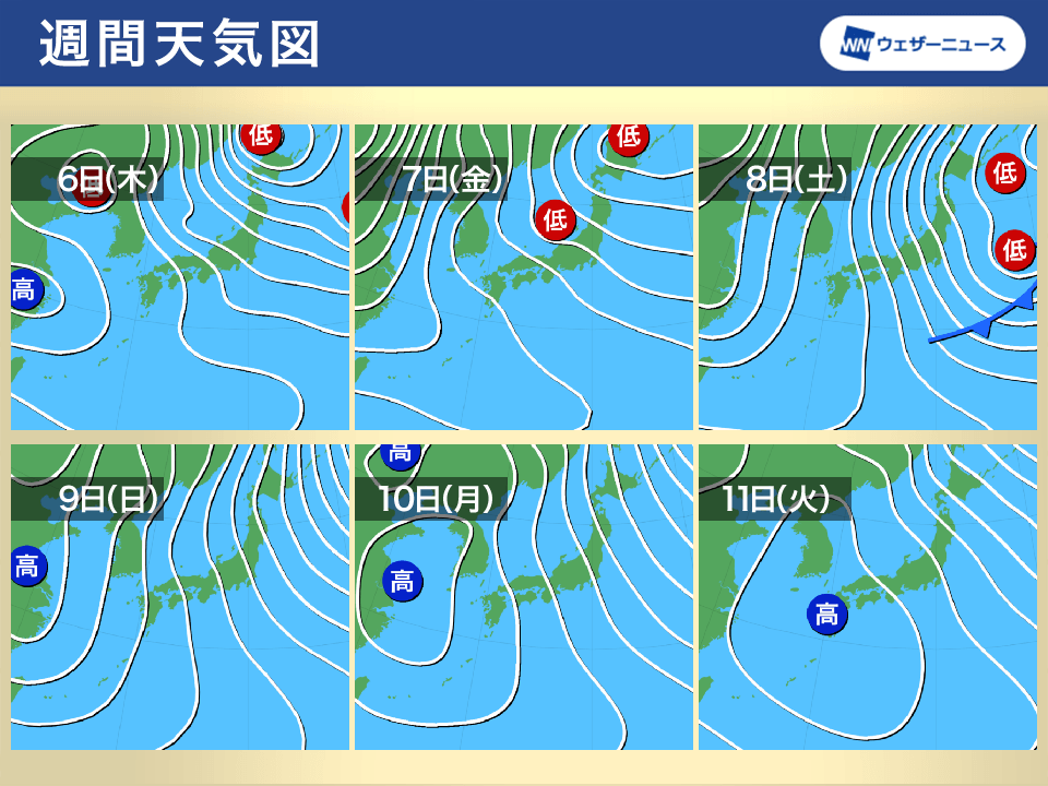 寒波は強弱をつけながら10日(月)頃まで続く予想です。西日本では今日が寒気のピークとなりますが、北陸や北日本では明日6日(木)午前中にかけてと、8日(土)〜9日(日)にかけて寒気の影響が強まるため、大雪や暴風雪に警戒が必要です。