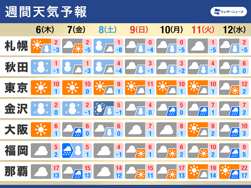 寒波による雪や風の影響は強弱を繰り返しますが、寒さは10日(月)頃まで緩む気配はありません。西日本を中心に平年よりもかなり気温の低い日が続き、晴れる関東でも真冬の寒さが続きます。防寒を万全にして、体調を崩さないようにしてください。