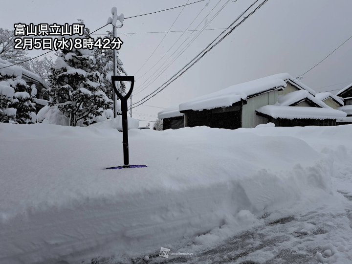 寒気の中心が抜けた後の明日6日(木)も強い冬型の気圧配置は継続し、積雪はさらに増加するとみられます。雪の降り方は断続的で、一時的に小康状態となるタイミングがありますので、落ち着いたタイミングで安全を確保しつつ、除雪を進めるようにしてください。