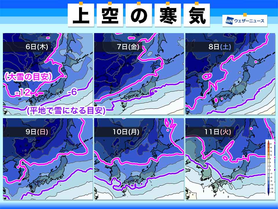 また寒気が一時的に弱まる7日(金)頃も、気圧の谷の通過により東北日本海側や北陸で積雪急増のおそれ、濃尾平野でも雪が降る可能性があります。