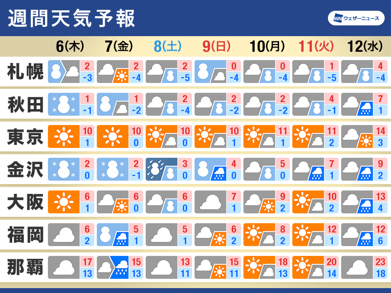 寒波は強弱をつけながら10日(月)頃まで続く予想です。西日本では今日が寒気のピークとなりますが、北陸や北日本では明日6日(木)午前中にかけてと、8日(土)〜9日(日)にかけて寒気の影響が強まるため、大雪や暴風雪に警戒が必要です。