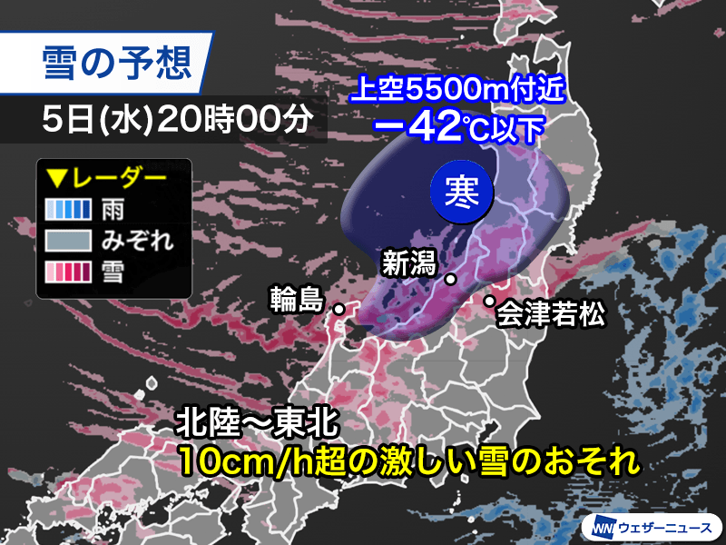 これから今夜にかけて上空5500m付近で−42℃以下の寒気の中心部分が北陸から東北南部を通過するため大気の状態が不安定になり、雪雲が発達しやすくなるとみられます。北陸や東北南部などで雪が強まり、局地的には1時間に10cm以上の雪が降る予想です。こうした強い雪が数時間にわたって続いて、積雪が急増するおそれがあります。