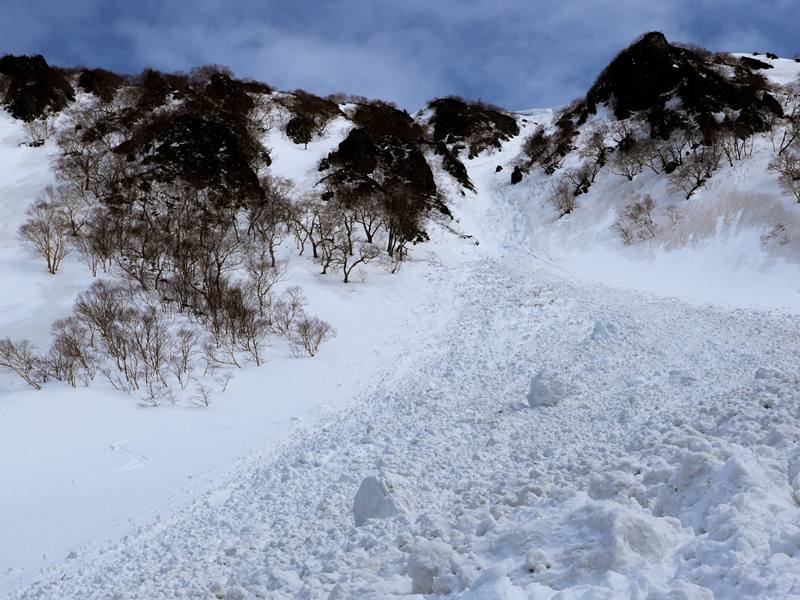 全層雪崩は気温が上昇する春先やフェーン現象の際、暖気によって積雪が溶けて深さが急に減少した際に発生しやすく、雨が降った後も発生の可能性が高まります。