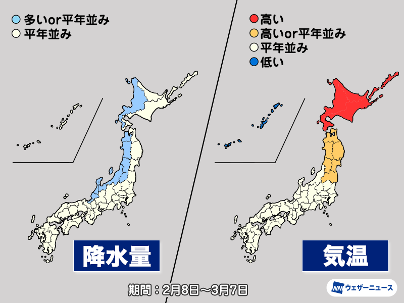 西日本や東日本では第1週目(2月8日~14日)に平年よりも気温が低くなる傾向ですが、第2週以降は平年並みとなり2月下旬になると東日本では平年よりも高くなる傾向です。