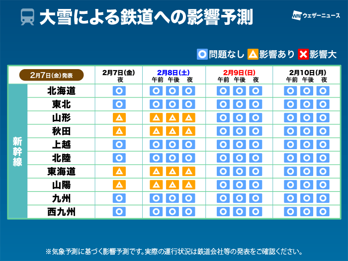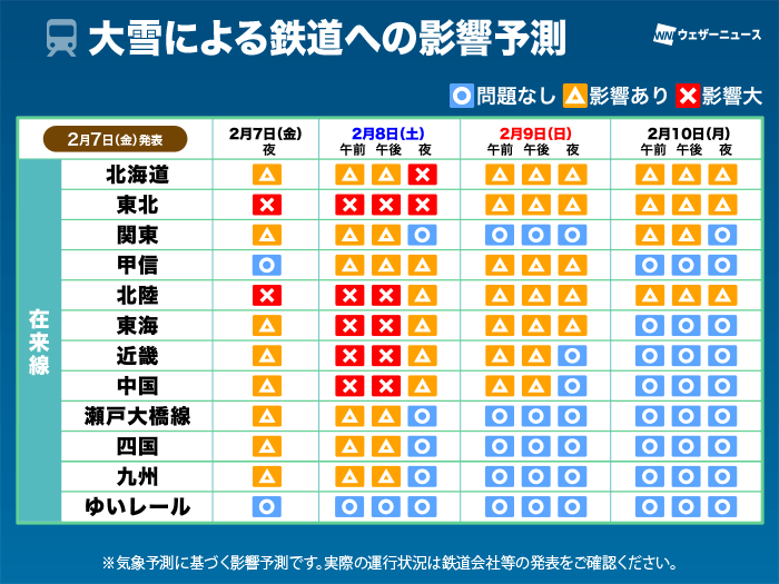 9日(日)以降は北日本や北陸、西日本の日本海側の路線を中心に遅延や一部運休など影響が残る予想です。