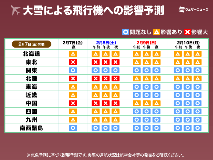 7日(金)夜から8日(土)にかけて、東北日本海側や北陸、山陰、九州北部の空港を中心に雪や風が強まり、各空港で欠航または条件付き運航が発生すると考えられます。
