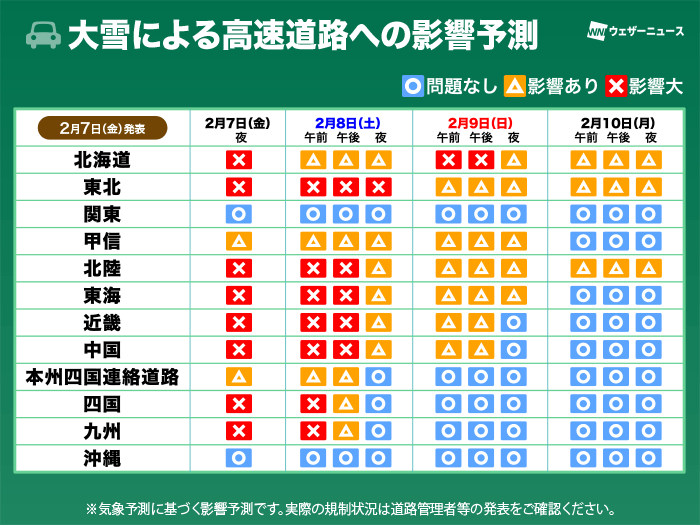 7日(金)夜から8日(土)にかけて、北日本や北陸、東海や西日本で大雪の影響で通行止めとなるおそれがあります。