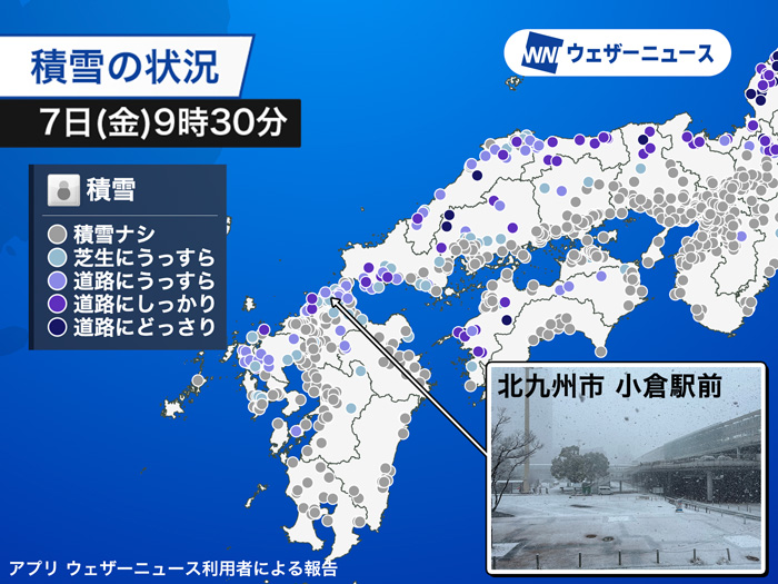 九州では7日(金)10時の時点で積雪を観測しているアメダス地点はありませんが、ウェザーニュースアプリの利用者からは積雪によって白くなった路面の報告が多数寄せられています。福岡市で積雪が観測されれば1月10日以来約1か月ぶりとなります。積雪によるスリップや転倒に注意が必要です。車を運転する場合は必ず冬タイヤを装着するようにしてください。