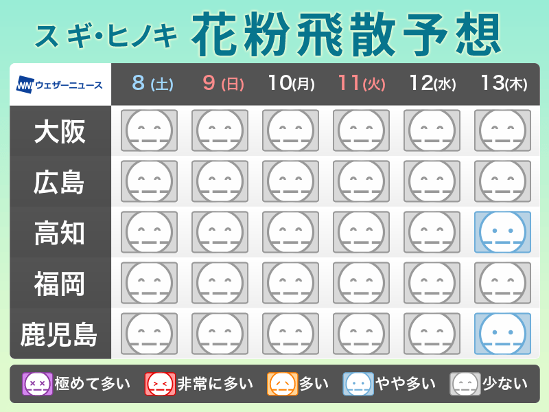 来週中頃以降、気温が上昇すると花粉が飛びやすくなり、飛散量が「やや多い」予想のところもあります。花粉症の症状が出はじめる方が増えてきそうなので、対策がまだの方はしっかり対策を行ってください。
