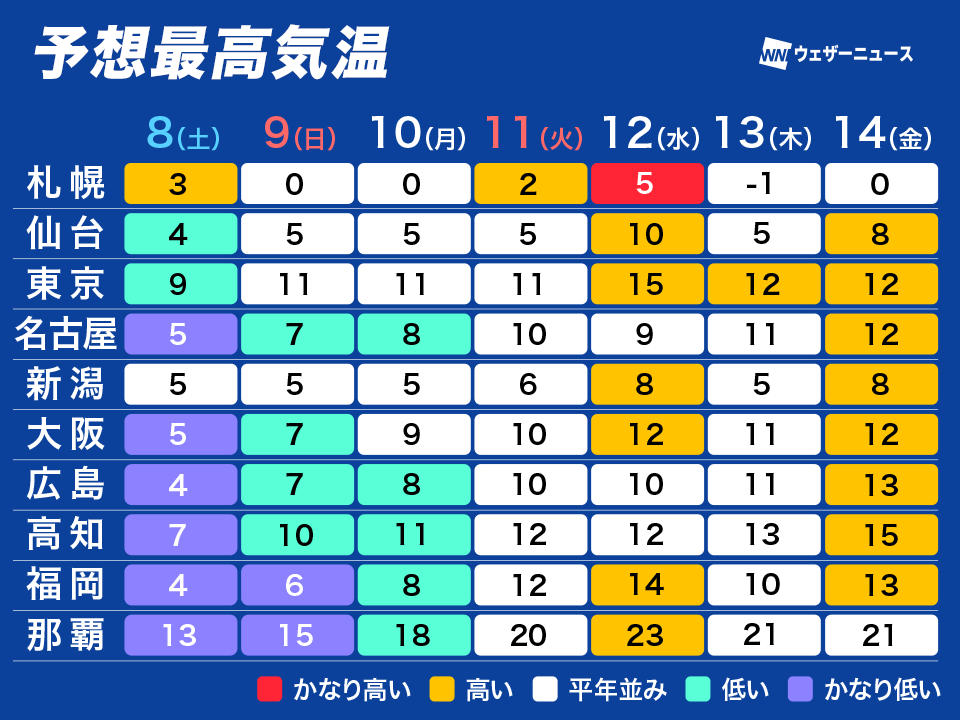 来週10日(月)頃まで西日本を中心に平年よりもかなり気温の低い日が続き、晴れる関東でも真冬の寒さが続きます。