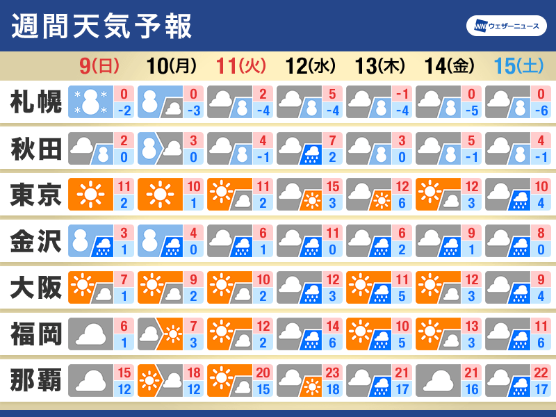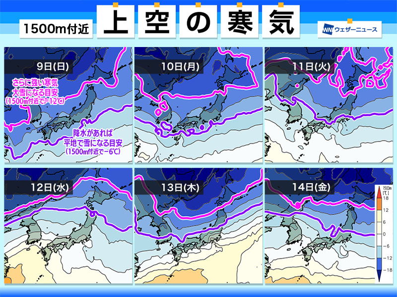 寒波による雪や風の影響は強弱を繰り返し、寒さは10日(月)頃まで緩む気配はありません。西日本を中心に平年よりもかなり気温の低い日が続き、晴れる関東でも真冬の寒さが続きます。防寒を万全にして、体調を崩さないようにしてください。