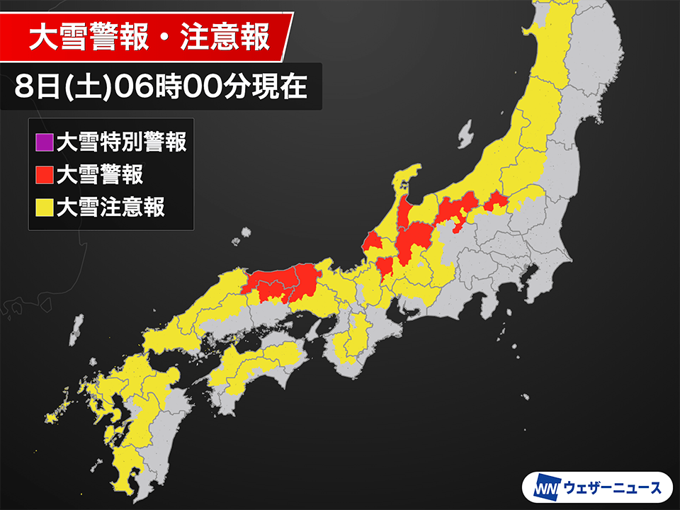 6時現在、大雪警報が岡山県、鳥取県、兵庫県、岐阜県、福井県、富山県、長野県、群馬県の一部に発表されています。