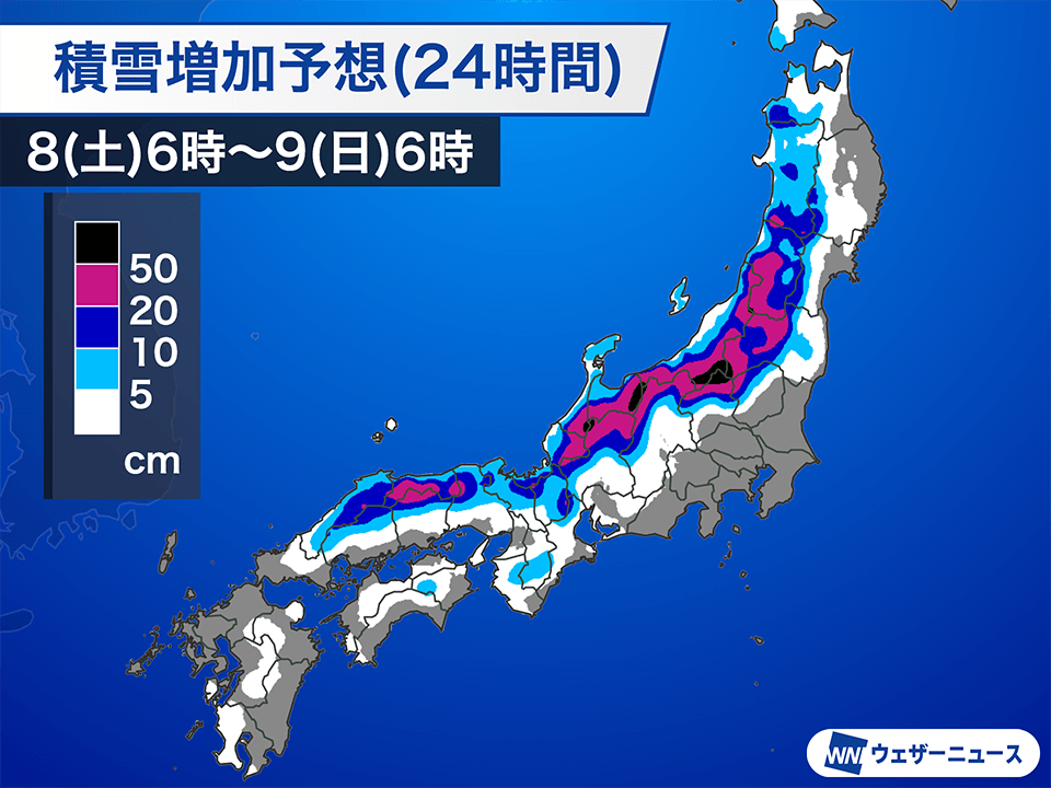 北陸や東北日本海側では寒波の影響がさらに長引き、あす9日(日)頃にかけて断続的に、場所によってはほぼ連続的に雪が降り、積雪がさらに増加する予想です。これまでの4日間で1m以上の降雪が観測されていますが、多いところではさらに1m以上の降雪がある見込みです。短時間で積雪が急増すると、登り坂でのスタック・立ち往生で身動きの取れない車が多発し、長時間に及ぶ大規模な車両滞留に発展するおそれがあります。