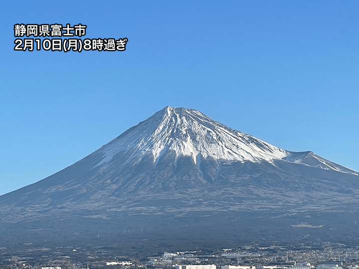 静岡県内の各地からは山頂から裾野まで雄大な姿がはっきりとみられています。ただ、山頂から中腹を覆っている雪は少なくなり、山肌が目立ってきました。富士山の麓に位置する富士市の降水量は2月に入ってわずか5.5mmと平年の4分の1で、1月も中旬から下旬にかけてまとまった降水はありませんでした。