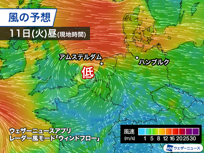 現地時間の11日(火)日中にかけてはドイツを中心に風が強まり、瞬間的には20m/s前後の突風が吹く見通しです。また、寒冷前線性の活発な雲が通過することで、局地的に雨氷となる可能性があるとしています。