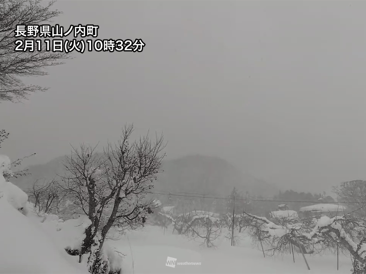 北日本、東日本は冬型の気圧配置が続いています。上空の寒気を伴った気圧の谷が通過している影響で一部で雪雲が発達し、多い所では12時間で30cm近い雪が降りました。10時までの12時間降雪量は新潟県湯沢町で26cm、津南町は24cm、長野県飯山市で21cmです。