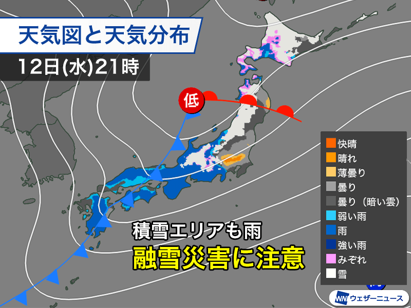 低気圧や前線通過で積雪地域も雨 急速に融雪が進むおそれ