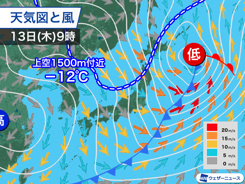 北日本の上空1500m付近には−12℃以下の強い寒気が流れ込むため日本海側は雪が降りやすく、猛吹雪になるおそれがあります。北海道から東北、新潟県にかけては視界不良となって交通機関に影響が出ることが考えられますので、移動などの予定変更も検討をしてください。