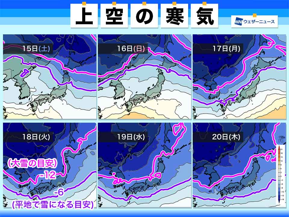 降水があれば平地で雪になる目安とされる上空約1500mで−6℃の寒気は、18日(火)から20日(木)にかけて九州南部や伊豆諸島付近まで南下します。このため全国的に気温が低くなる見込みです。