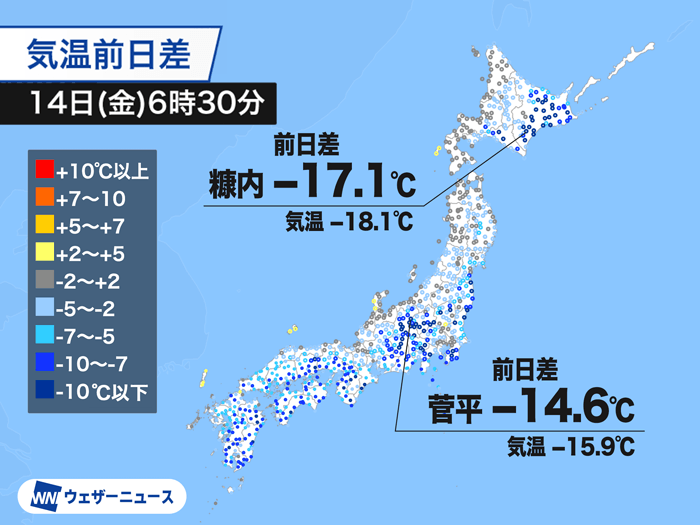 そのため、昨日の朝との気温差が激しく、北海道の道東、幕別町にあるアメダス糠内では、昨日の同じ時間よりも17.1℃も低くなりました。そのほか、長野県上田市のアメダス菅平や南牧村のアメダス野辺山でも昨日より14.6℃低くなっています。全国的に見ても昨日よりも気温の下がっているところがほとんどです。