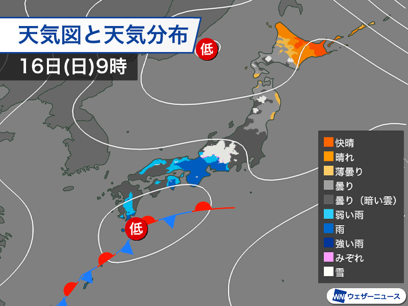 明日15日(土)の夜に東シナ海で低気圧が発生して近づいてきます。九州の早い所では夜遅い時間から雨が降り出し、明後日16日(日)は雨の範囲が拡大する見込みです。