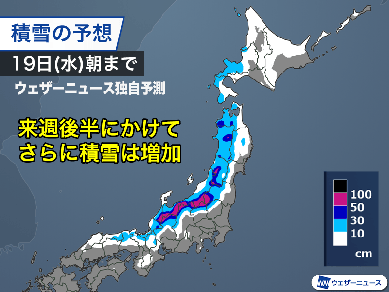19日(水)朝までに50cm以上の積雪、その後はさらに増える