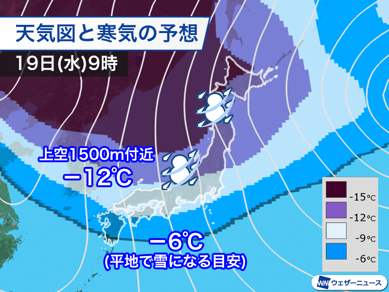 19日(水)頃が寒気のピークで、上空1500m付近で−6℃以下の平地で雪を降らせる目安の寒気が日本列島の大部分を覆い、大雪をもたらす−12℃以下の寒気が東北南部や北陸付近まで南下する予想です。