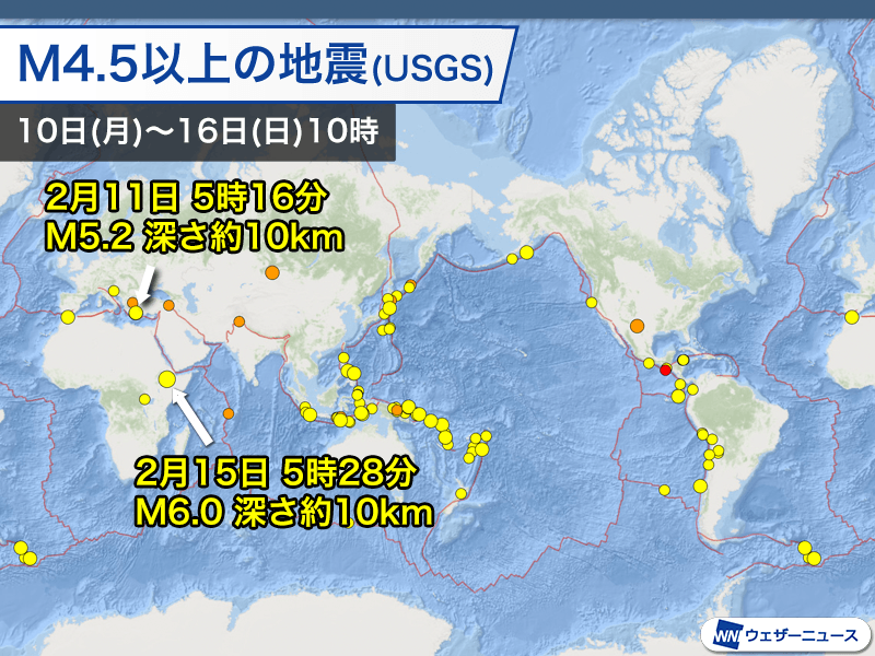 アメリカ地質調査所の解析によるマグニチュード6以上の地震は1回発生しています。最も大きな地震はアフリカで発生したマグニチュード6.0です。