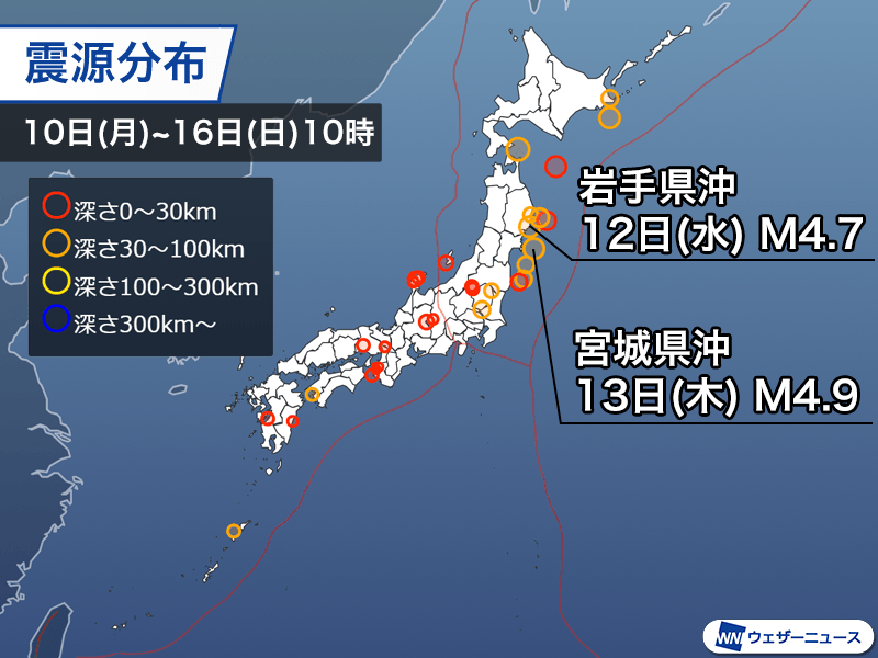 また、13日(木)6時04分頃には宮城県沖を震源とするマグニチュード4.9、深さ52kmと推定される地震が発生しました。この地震で宮城県仙台市宮城野区、気仙沼市、登米市、大崎市、石巻市、岩手県大船渡市、北上市、一関市などで最大震度3を観測しています。