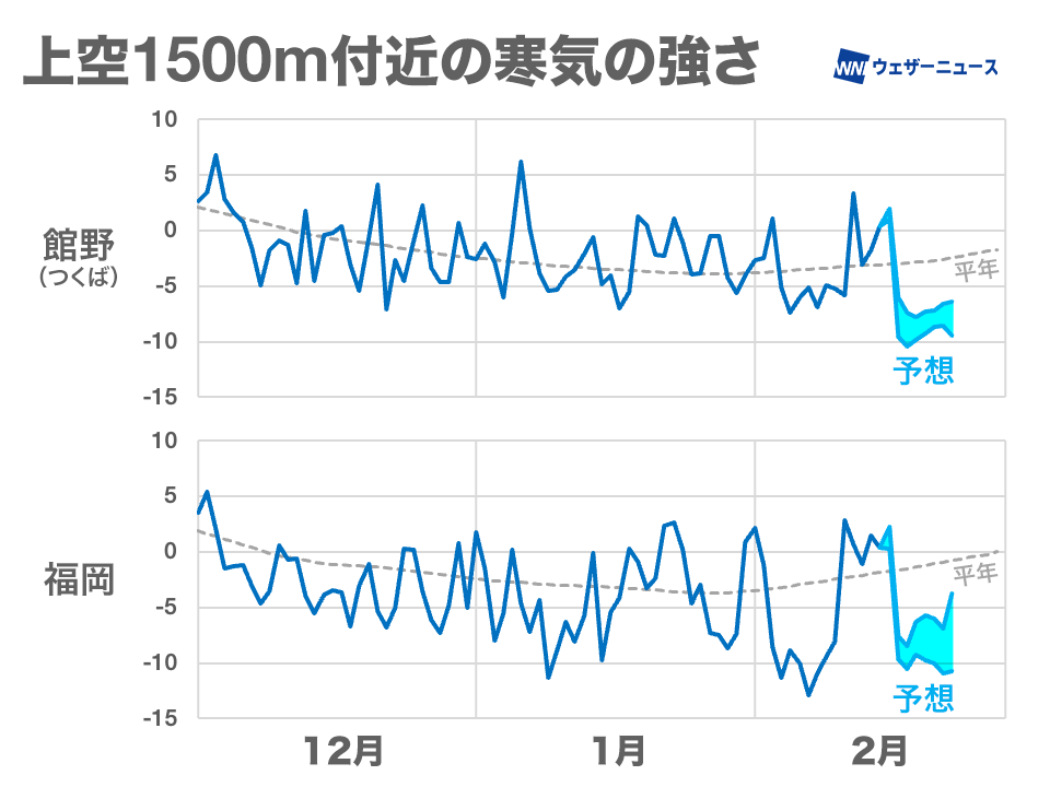 寒さの緩みは一時的で、西日本や沖縄では明日17日(月)から、東日本や北日本では明後日18日(火)から強い寒気の影響を受け始めます。西日本や東日本の上空1500m付近には−9℃前後の寒気が流れ込む予想で、これは一年の最も寒い時期の平均より低く、2月後半としては平年より4〜10℃程度低い気温といえます。今月上旬に襲来した寒波に匹敵するような所もありそうです。