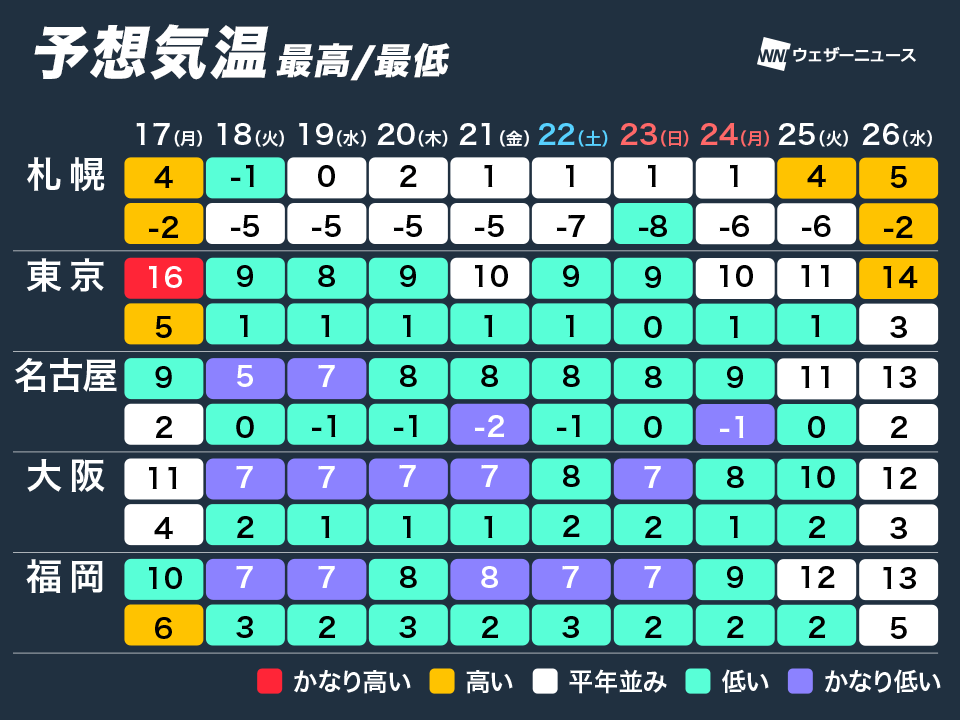西日本では都市部でも最高気温が10℃に届かない日が多く、名古屋でも最低気温が0℃未満の冬日が予想されています。比較的気温の高い東京でも最高気温が10℃前後、最低気温は0℃前後の日が続く予想です。
