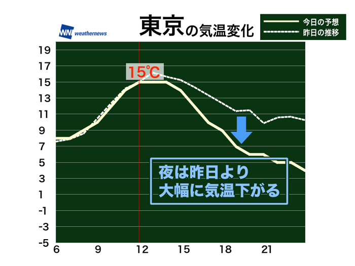 ただ、夕方以降は寒気の影響で気温が一気に下がっていきます。夕方以降の気温を昨日と比べると5℃前後低くなるところが多く、東京都心では21時頃には5℃を下回ってくる見込みです。