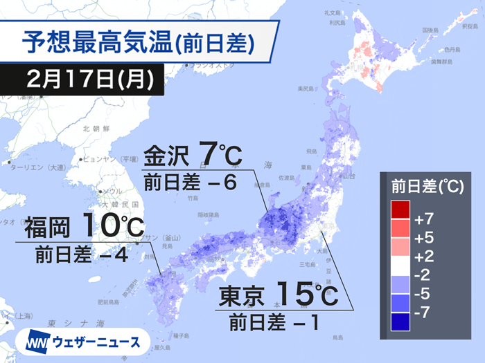 今日は上空には徐々に寒気が流れ込み始めるため、中部地方や西日本では昨日と比べると気温の下がるところが多くなります。予想最高気温は金沢では昨日よりも6℃低い7℃、名古屋では昨日よりも4℃低い10℃と、2月中旬頃の気温に戻ります。そのほかのところでも昨日よりも気温が低くなるところが多く、風も強まるため暖かさはほどんど感じられません。