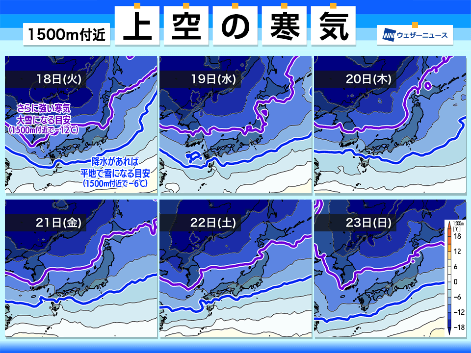 その後も日本列島の上空に寒気が居座り、22日(土)・23日(日)天皇誕生日・24日(月)振替休日の三連休の頃まで断続的に寒気の影響を受ける見通しです。