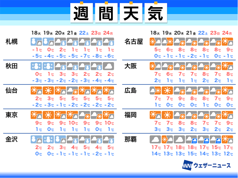 西日本では今日から、東日本や北日本でも明日18日(火)からは真冬の気温が続くようになり、東京や大阪などでも最高気温が10℃に届かず、朝は0℃前後の日が続く見通しです。