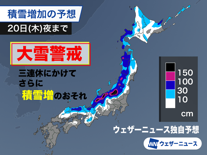 今日の午前中は北陸や東北の平地では雨が降る予想です。午後は次第に雪へと変わり、今週は断続的に強まるタイミングがある見込みです。20日(木)夜までで内陸の地域では100cm以上の雪が降り、山沿いの多いところでは150cm以上の積雪の増加となるおそれがあります。