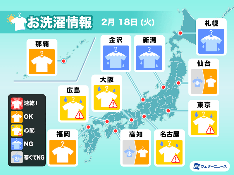 北日本〜四国の太平洋側は、日差しが届いても急な雪や雨の可能性があります。外干しする場合は空の変化に注意してください。