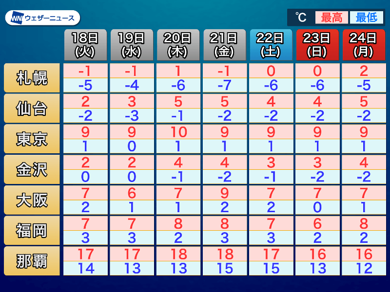 22日(土)からの三連休も、気温の低い状況は続く見込みです。体調を崩さないよう、服装選びに注意してお過ごしください。