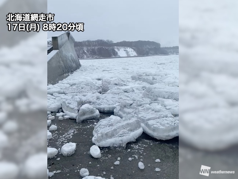 網走では二日前の15日(土)に、海岸から沖合にある流氷を目視で確認できた最初の日である「流氷初日」が発表されていました。ここ数日はオホーツク海に発達した低気圧があり北西の風が続いていたため、沖合の流氷が一気に岸まで到達したとみられます。「流氷初日」は統計開始以来最も遅い観測でしたが、「流氷接岸初日」は2012年と同日で4位タイの遅い記録となりました。