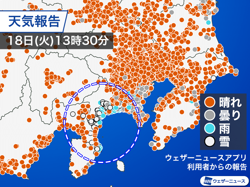 伊豆諸島北部から伊豆半島、神奈川県を中心に雲が広がり、一部では雪や雨が降っています。ウェザーニュースアプリ利用者からの天気報告では伊豆半島の東海岸や神奈川県西部で雪の雨が目立っていて、横浜市周辺でも雨の報告が散見される状況です。