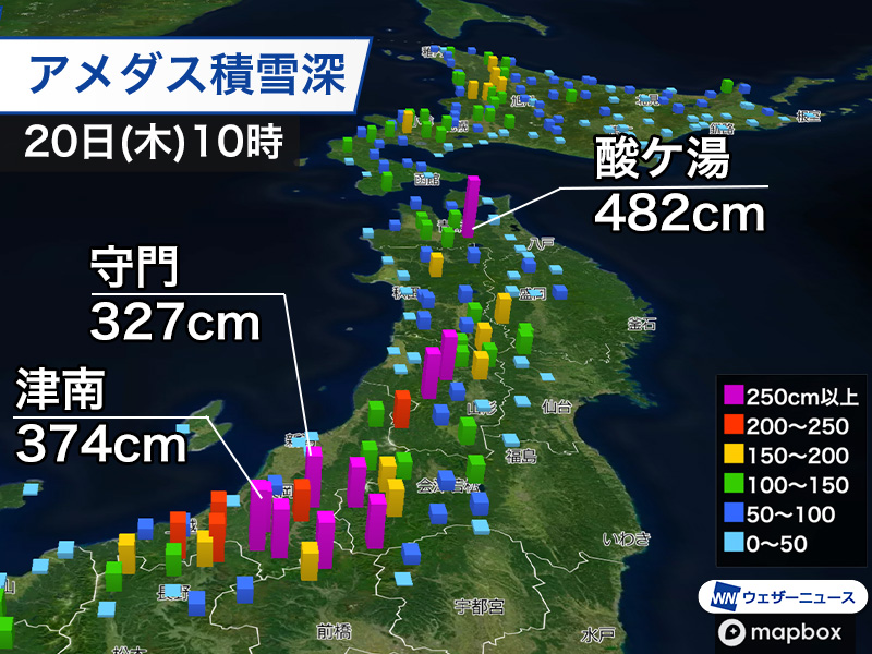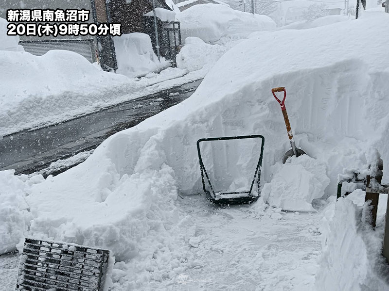 新潟県や周辺の山間部では特に積雪が多くなっています。今日20日(木)も降雪が続き、新潟県湯沢町の積雪は9時に平年の倍近い3mに達しました。