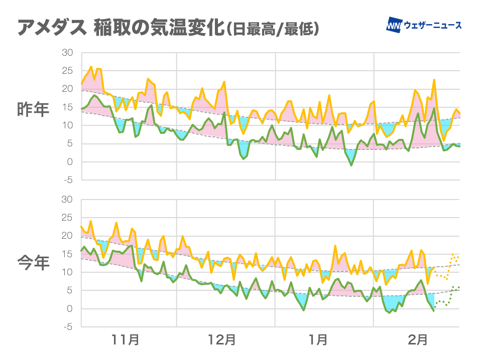 今年の河津桜の見頃が遅れている原因として、2月の寒波の影響が考えられます。河津町に近い東伊豆町のアメダス稲取のデータをみると、2月に入ってからの気温の推移が昨年と比べて大幅に低い様子がわかります。開花時期の気温の低さは、直接的に開花の促進を遅らせているとみられます。