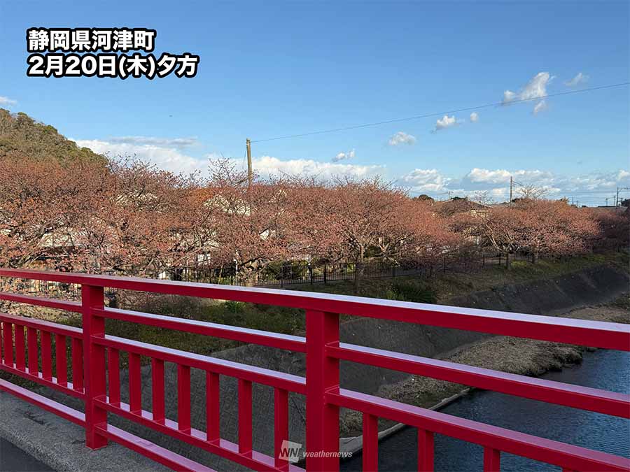 一方、今年は今日2月21日(金)の時点で町内の多くの場所で咲き始め〜一分咲き程度で、今週末の三連休も見頃にはまだ早い状況といえそうです。河津町観光協会によると、今年の見頃は昨年よりも2週間以上遅く、3月上旬になる見通しとのことです。