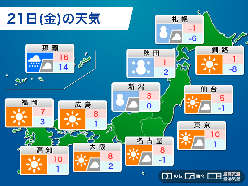 明日21日(金)も冬型の気圧配置が続き、朝は各地で冷え込む見込みです。