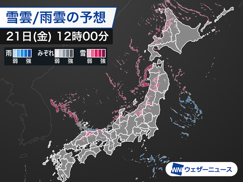 明日21日(金)にかけても冬型の気圧配置が続きます。上空には今日と同じくらいの寒気が居座り、日本海側では局地的に活発な雪雲がかかる見込みです。