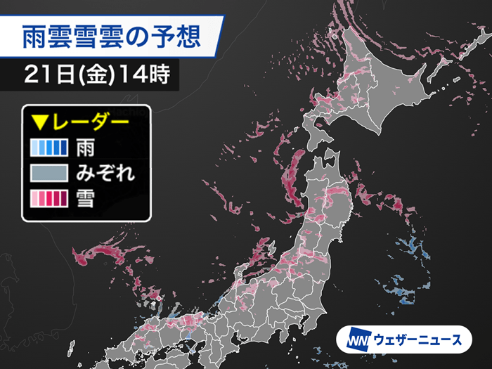 今日21日(金)も冬型の気圧配置が続きます。日本海側の各地は雪が降り、山沿いを中心に積雪が増加する見込みです。