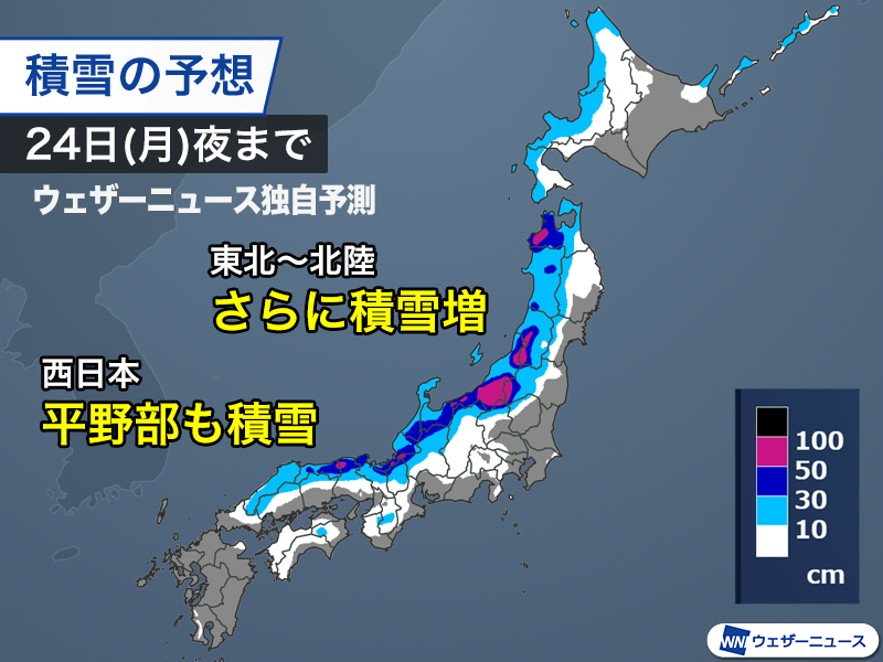24日(月)・振替休日の夜までの積雪の増加量は東北や北陸、近畿北部の山沿いで50〜80cmを予想しています。寒波の前半に比べると西日本の積雪が増える見通しで、近畿北部から山陰の平野部や、四国山地・紀伊山地で10〜30cmの雪が積もる見込みです。近畿中南部や四国、山陽の平野部でも積雪の可能性があります。